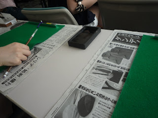 These were the tools we used. It kinda felt like art class when I was younger what with laying out all the newspaper and everything. Tanaka-sensei said you can pretty much use any brush to do it. I was dubious but she said she sometimes uses children's paint brushes and her work is amazing.