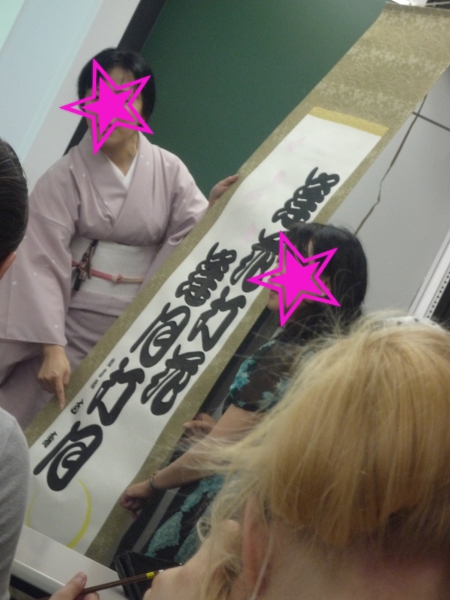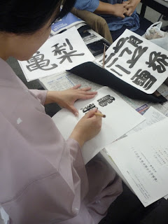 Here Taknaka-sensei (the woman that came in to teach us) and my regular teacher are showing us some of the kind of writing we were going to be attempting in that class. I must admit I was a bit wary since I am rubbish at 書道 (Japanese calligraphy) and I thought I'd fail equally at this.